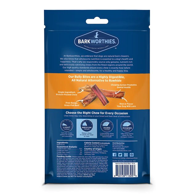 Treats to go! Each of the chews in the travel-sized pouch of Barkworthies Beef Bully Bites Dog Chews is packed full of a natural beef bully flavor that your pup’s best buds will covet. These drool-worthy chews are made using bone-a-fide beef from free-range cattle that are USDA and FDA inspected and approved. Crafted with your pup’s health in mind—they’re highly digestible and will fight bad doggy breath as he chews. Their unique shape and enticing texture make these bite-sized chews a paw-fect alternative to traditional rawhide.