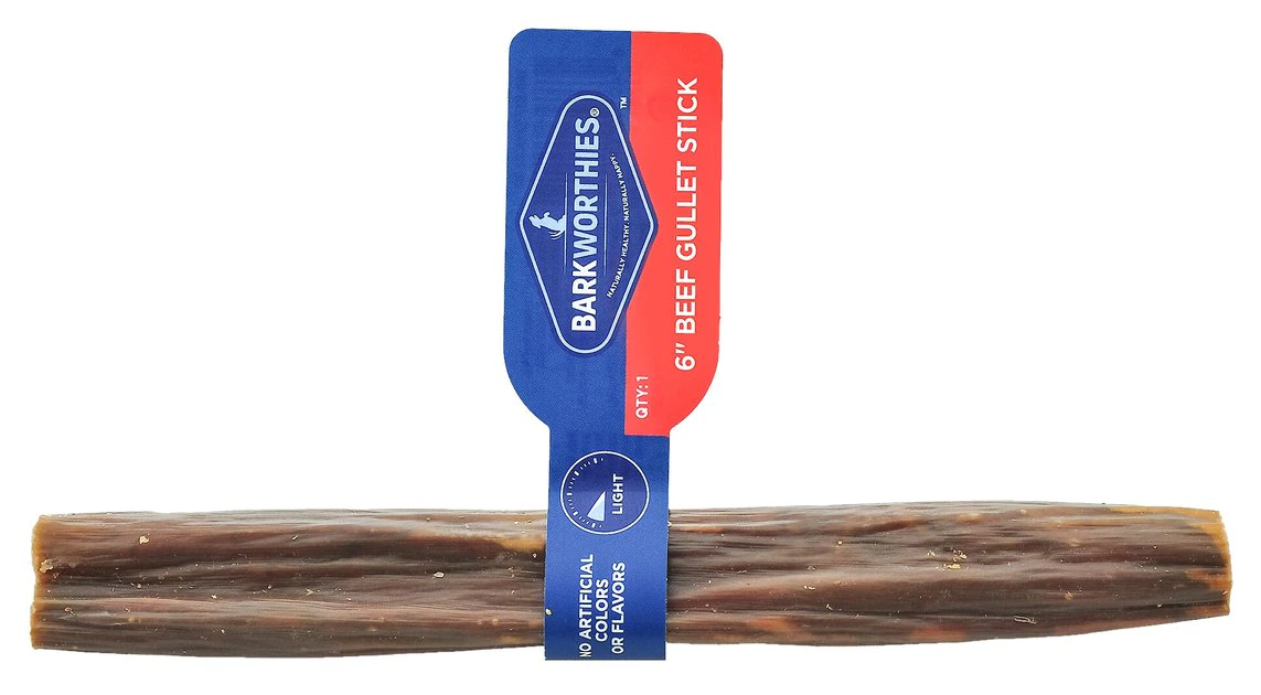 Barkworthies All-Natural Beef Gullet Sticks are high-protein dog chews made from high quality Argentinian beef. These all-natural dog chews measure approximately 6 inches in length and are great for aggressive chewers. As beneficial as they are delicious, these Beef Gullet chews clean your dog’s teeth as he gnaws! In addition to preventing buildup of tartar and plaque, these healthy dog treats also feature a natural source of glucosamine — an amino acid shown to aid in joint health. Made with only the best, most wholesome ingredients, these nutritious dog chews are part of Barkworthies full line of all-natural dog products. Additive-free, preservative-free, and chemical-free, Barkworthies strives to provide the healthiest options for your four-legged loved ones.