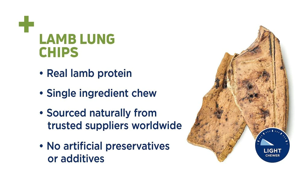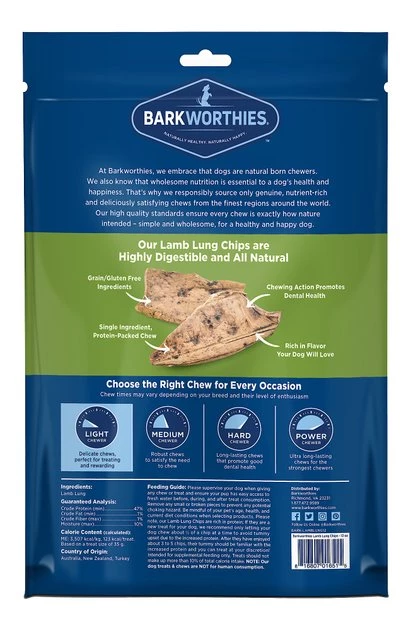 Barkworthies Lamb Lung Treats are easily broken into smaller pieces, making them a great training treat used to reward good behavior. They’re also low in fat and high in protein making them perfect for a healthy, daily snack! Barkworthies Lamb Lung Treats are suitable to feed your pet at any stage of life – from puppy to mature adult. Most importantly, dogs love the taste! Barkworthies Lamb Lung Treats are baked, 100% lamb lung, 100% digestible and sourced from America’s Heartland. Barkworthies Lamb Lung is a great dog treat for sensitive stomachs. These all-natural, American made dog treats are packed with vitamin A, which is essential to your dog’s liver function. As with all of their products, Barkworthies are additive-free, chemical-free, and preservative-free dog chews. In fact, most Barkworthies products are single-ingredient chews, making them all natural, healthy and safe for your dog.