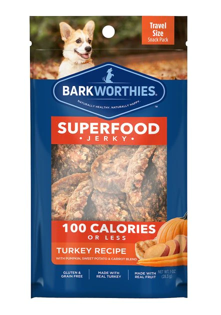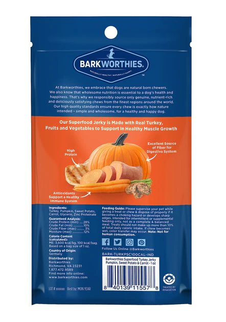 Barkworthies Turkey Jerky Recipe with Pumpkin, Sweet Potato & Carrot Blend Dog Treats are the perfect on-the-go snack for your pal. At just 100 calories per serving, this jerky is made with high-quality protein from real turkey and healthy superfoods including pumpkin, sweet potato and carrots. Plus, they can be used as a tasty training treat. Barkworthies turkey jerky combines convenience, mouthwatering flavor and nutrition all in one easy snack your dog will love!