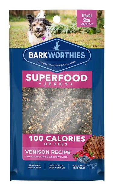 Barkworthies Venison Jerky Recipe with Blueberry & Cranberry Blend Dog Treats are the perfect on-the-go snack for your pal. At just 100 calories per serving, this jerky is made with high-quality protein from real venison and healthy superfoods including blueberries and cranberries. Plus, they can be used as a tasty training treat. Barkworthies venison jerky combines convenience, mouthwatering flavor and nutrition all in one easy snack your dog will love!