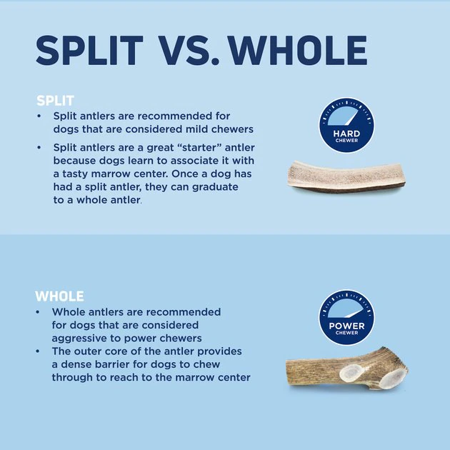 - Whole antler with marrow inside—encourages chewers to work for their reward!