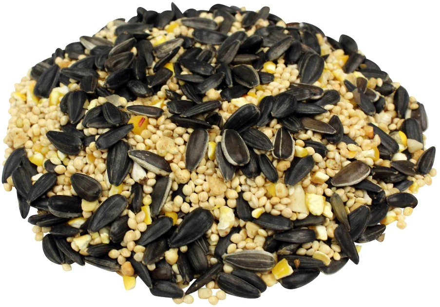 White Proso Millet, Black Oil Sunflower Seeds, Striped Sunflower Seeds, Cracked Corn and Peanuts.