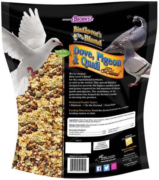 Brown’s Bird Lover’s Blend Dove, Pigeon & Quail Blend Bird Food provides a highly nutritious and special blend of quality seeds and grains to feed doves, pigeons and quail. This natural mix features red and white millet, milo, wheat, green peas, canary seeds, oats, safflower seeds and popcorn for lasting year-round energy. Whether you’re an experienced hobbyist or a novice, this food has everything you’ll need to bring these delightful birds to your feeder.
