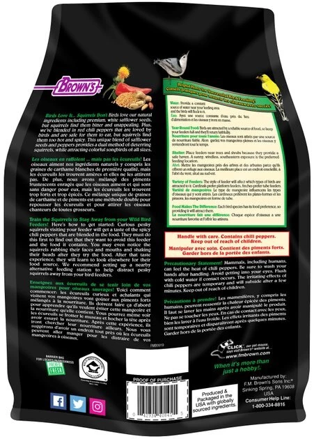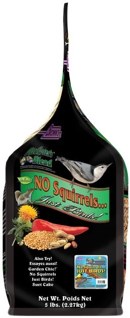 Brown’s Bird Lover’s Blend No Squirrels… Just Birds! Wild Bird Food is a unique solution to bird watching woes because it helps keep squirrels out of your feeders. It’s made with premium white millet for carbs and safflower seeds that are high in fat and oil for extra energy. The secret ingredient is chili pepper for a fiery hot taste that deters squirrels but doesn’t bother birds that can’t feel the spicy sensation. Squirrels also find the white safflower seeds to be bitter, so they’ll surely stay away while wild birds enjoy a gourmet meal of natural ingredients.