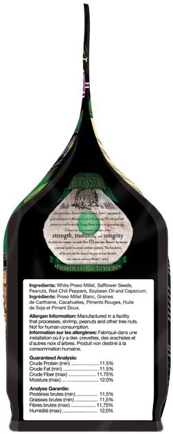 White Proso Millet, Safflower Seeds, Peanuts, Red Chili Peppers, Soybean Oil and Capsicum.