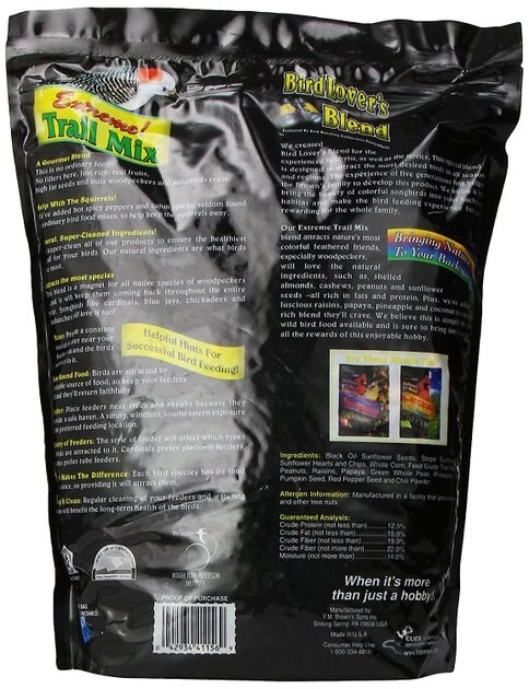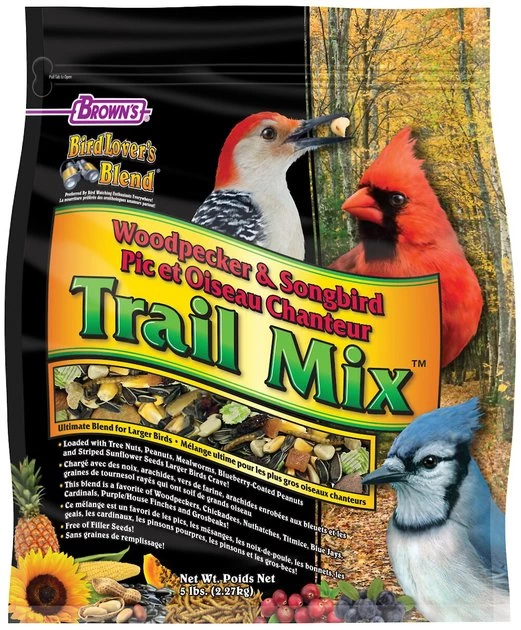 Brown’s Bird Lover’s Blend Trail Mix Woodpecker & Songbird Wild Bird Food has everything a trail mix should, but it’s made especially for woodpeckers and songbirds like cardinals, blue jays, chickadees and nuthatches. This fruit and nut blend features chunks of papaya and pineapple with raisins, coconut shreds, sunflower seeds and an assortment of premium shelled nuts. These ingredients are rich in fats and protein to attract all native woodpecker species along with colorful songbirds. Squirrels are sure to stay away with the added secret ingredients of hot pepper seeds and Cajun spices.