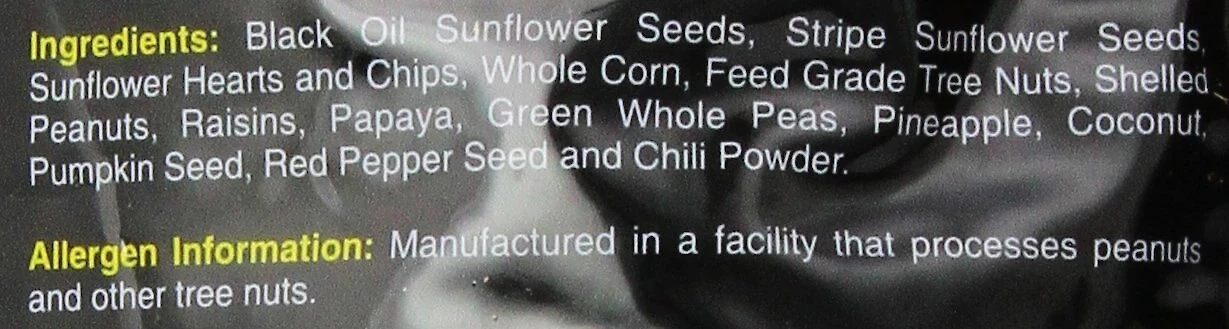 Striped Sunflower Seeds, Corn, Peanuts, Mixed Feed Nuts, Flaked Peas, Dried Papaya, Dried Pineapple, Raisins, Dried Cranberries, Dehydrated Mealworms, Dehydrated Blueberry, Wheat Flour, Sugar, Corn Starch, Sunflower Oil, Apple Cider Vinegar, Colors Added (Red 40, Yellow 5 & 6) and Sulfur Dioxide (a preservative).