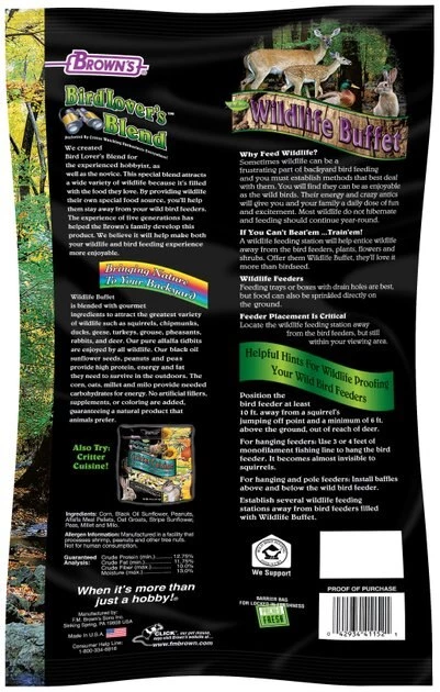 Your backyard will become a blend of bird-watching and wildlife feeding with Brown’s Bird Lover’s Blend Wildlife Buffet Nature’s Harvest Wild Bird Food. You can use this gourmet blend to create a separate wildlife area away from bird feeders, plants and flowers by filling a feeding tray or box equipped with drainage holes. Or simply spread it along the ground to add extra excitement by attracting chipmunks, ducks, rabbits, deer and a whole array of wildlife.