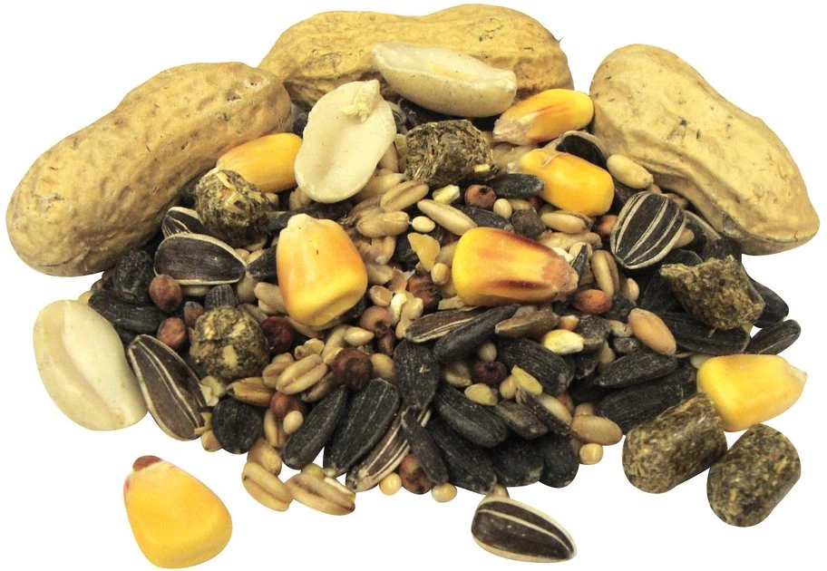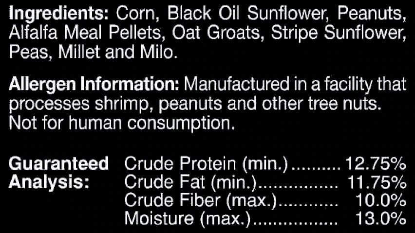 Corn, Black Oil Sunflower Seeds, Peanuts, Alfalfa Meal Pellets, Oat Groats, Stripe Sunflower, Peas, Millet and Milo.