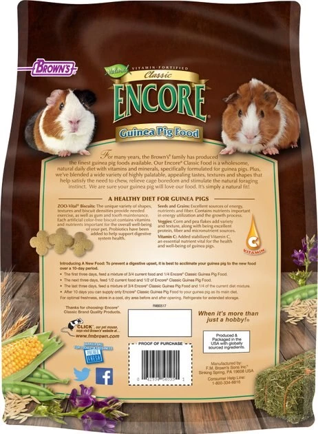 Brown’s Encore Classic Natural Guinea Pig Food has everything your tiniest furry friend needs in his daily diet in a flavorful and nutritious natural blend. This premium food has a unique mix of field-fresh alfalfa hay, corn, vitamin-rich crunchy ZOO-Vital biscuits and stabilized vitamin C to support a healthy immune system. These tasty hay pellets and nutrient-rich biscuits deliver essential vitamins and minerals along with beneficial bacteria to facilitate digestion.