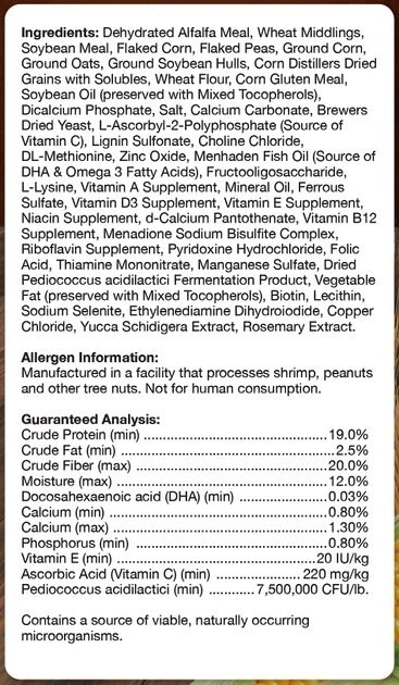 Dehydrated Alfalfa Meal, Wheat Middlings, Soybean Meal, Flaked Corn, Flaked Peas, Ground Corn, Ground Oats, Ground Soybean Hulls, Corn Distillers Dried Grains with Solubles, Wheat Flour, Corn Gluten Meal, Soybean Oil (preserved with Mixed Tocopherols), Dicalcium Phosphate, Salt, Calcium Carbonate, Brewers Dried Yeast, L-Ascorbyl-2-Polyphosphate (Source of Vitamin C), Lignin Sulfonate, Choline Chloride, DL-Methionine, Zinc Oxide, Menhaden Fish Oil (Source of DHA & Omega 3 Fatty Acids), Fructooligosaccharide, L-Lysine, Vitamin A Supplement, Mineral Oil, Ferrous Sulfate, Vitamin D3 Supplement, Vitamin E Supplement, Niacin Supplement, d-Calcium Pantothenate, Vitamin B12 Supplement, Menadione Sodium Bisulfite Complex, Riboflavin Supplement, Pyridoxine Hydrochloride, Folic Acid, Thiamine Mononitrate, Manganese Sulfate, Dried Pediococcus acidilactici Fermentation Product, Vegetable Fat (preserved with Mixed Tocopherols), Biotin, Lecithin, Sodium Selenite, Ethylenediamine Dihydroiodide, Copper Chloride, Yucca Schidigera Extract, Rosemary Extract.