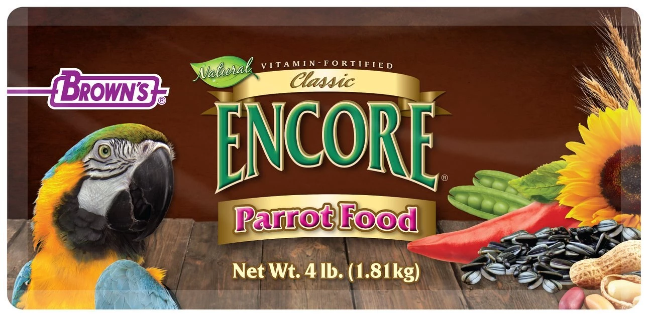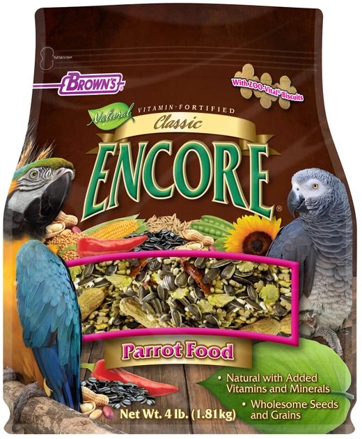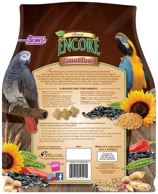 Brown’s Encore Classic Natural Parrot Bird Food is a natural daily diet for parrots with added vitamins and minerals. Exciting shapes, appealing flavors and enticing textures will help keep foraging instincts sharp while relieving cage boredom. Your parrot will enjoy the wholesome mix of striped sunflower seeds, safflower seeds, grains, peanuts and a little bit of spice from dried peppers. ZOO-Vital baked biscuits provide beneficial bacteria for optimal digestion and essential nutrients for the overall well-being of your pet.