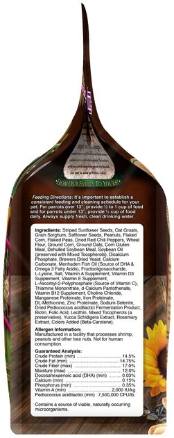 - wholesome, natural daily diet with vitamins and minerals, specifically formulated for parrots