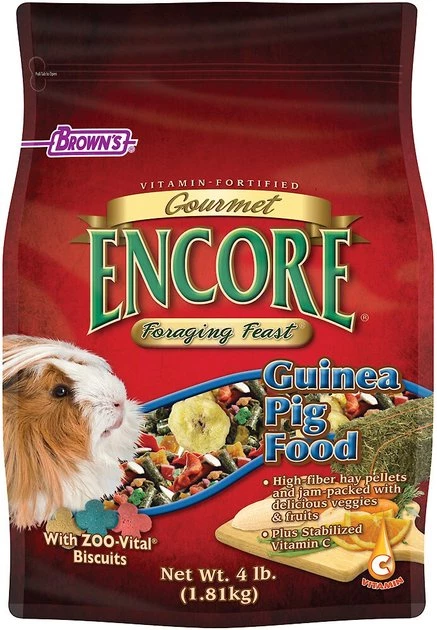 Make sure your furry friend is getting everything she needs with Brown’s Encore Gourmet Foraging Feast Guinea Pig Food. This premium diet is fortified with vitamins and minerals to enhance your guinea pig’s well-being. The ingredients come in fun shapes and textures to help satisfy the need to chew, relieve cage boredom and stimulate natural foraging instincts. With a medley of specialized delicacies, Brown’s Encore Gourmet Foraging Feast Guinea Pig Food will quickly become your companion’s favorite meal.