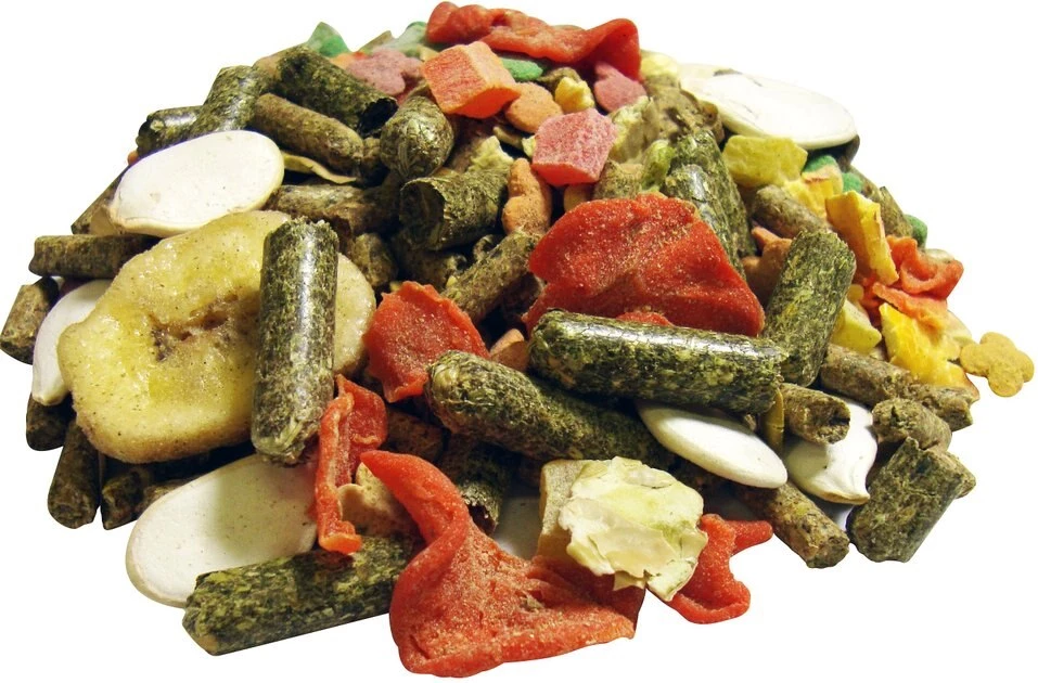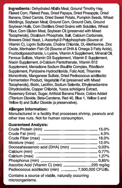 Dehydrated Alfalfa Meal, Ground Timothy Hay, Flaked Corn, Flaked Peas, Dried Papaya, Dried Pineapple, Dried Banana, Dried Carrots, Dried Sweet Potato, Pumpkin Seeds, Wheat Middlings, Soybean Meal, Ground Corn, Ground Oats, Ground Soybean Hulls, Distillers Dried Grains with Solubles, Wheat Flour, Corn Gluten Meal, Soybean Oil (preserved with Mixed Tocopherols), Dicalcium Phosphate, Salt, Calcium Carbonate, Brewers Dried Yeast, L-Ascorbyl-2-Polyphosphate (Source of Vitamin C), Lignin Sulfonate, Choline Chloride, DL-Methionine, Zinc Oxide, Menhaden Fish Oil (Source of DHA & Omega 3 Fatty Acids), Fructooligosaccharide, L-Lysine, Vitamin A Supplement, Mineral Oil, Iron Oxide, Vitamin D3 Supplement, Vitamin E Supplement, Niacin Supplement, d-Calcium Pantothenate, Vitamin B12 Supplement, Menadione Sodium Bisulfite Complex, Riboflavin Supplement, Pyridoxine Hydrochloride, Folic Acid, Thiamine Mononitrate, Manganese Sulfate, Dried Pediococcus acidilactici Fermentation Product, Vegetable Fat (preserved with Mixed Tocopherols), Biotin, Lecithin, Selenium Yeast, Sodium Selenite, Ethylenediamine Dihydriodide, Copper Chloride, Yucca Schidigera Extract, Rosemary Extract, Beta-Carotene, Artificial Banana Flavor, Colors Added (Titanium Dioxide, Red 40, Blue 1, Yellow 5 and Yellow 6) and Sulfur Dioxide (a preservative).), Yucca Schidigera Extract, Rosemary Extract, Beta-Carotene, Artificial Banana Flavor, Colors Added (Titanium Dioxide, Red 40, Blue 1, Yellow 5 and Yellow 6) and Sulfur Dioxide (a preservative).