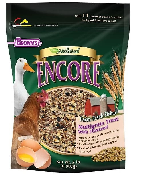 Brown’s Encore Multigrain Flaxseed Chicken Treat drive domesticated fowl wild, be they chickens, ducks, geese or turkeys. They’re made of the eleven gourmet seeds that birds adore most. What’s more, they’re also packed with flax seeds — for a boost of omega-3 fatty acids to enrich the eggs of your fine feathered friends. They’ll eagerly gobble up these treats for their delicious, hearty multigrain flavor.