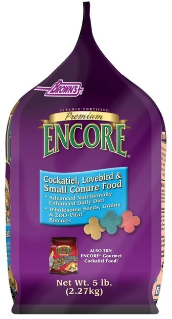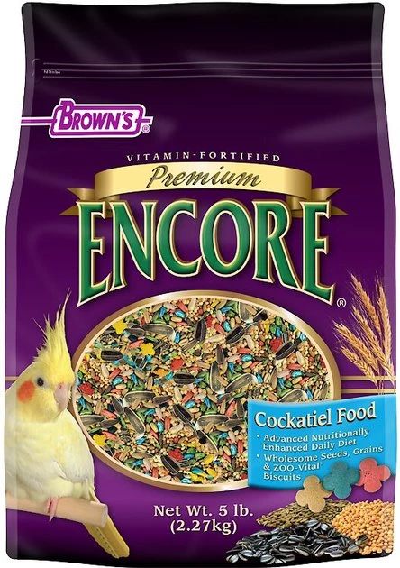 Brown’s Encore Premium Cockatiel Bird Food is specially formulated as a wholesome, nutritionally advanced daily diet for cockatiels. It’s fortified with essential vitamins and minerals and has all their favorite foods, including red and white millet, corn, oats, canary seeds, safflower seeds and striped sunflower seeds. The variety of colors, flavors, textures and shapes stimulate their natural foraging instincts, which helps to relieve cage boredom by making feeding time more exciting.