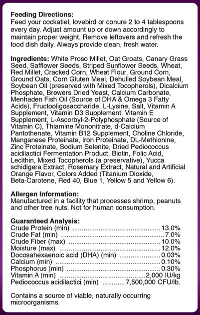 White Proso Millet, Oat Groats, Canary Grass Seed, Safflower Seeds, Striped Sunflower Seeds, Wheat, Red Millet, Cracked Corn, Wheat Flour, Ground Corn, Ground Oats, Corn Gluten Meal, Dehulled Soybean Meal, Soybean Oil (preserved with Mixed Tocopherols), Dicalcium Phosphate, Brewers Dried Yeast, Calcium Carbonate, Menhaden Fish Oil (Source of DHA & Omega 3 Fatty Acids), Fructooligosaccharide, L-Lysine, Salt, Vitamin A Supplement, Vitamin D3 Supplement, Vitamin E Supplement, L-Ascorbyl-2-Polyphosphate (Source of Vitamin C), Thiamine Mononitrate, d-Calcium Pantothenate, Vitamin B12 Supplement, Choline Chloride, Manganese Proteinate, Iron Proteinate, DL-Methionine, Zinc Proteinate, Sodium Selenite, Dried Pediococcus acidilactici Fermentation Product, Biotin, Folic Acid, Lecithin, Mixed Tocopherols (a preservative), Yucca schidigera Extract, Rosemary Extract, Natural and Artificial Orange Flavor, Colors Added (Titanium Dioxide, Beta-Carotene, Red 40, Blue 1, Yellow 5 and Yellow 6).