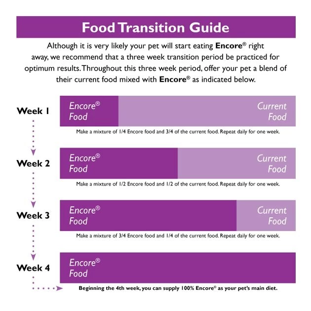 - Week 1: Mix 1/4 of food to 3/4 of current food.