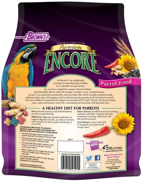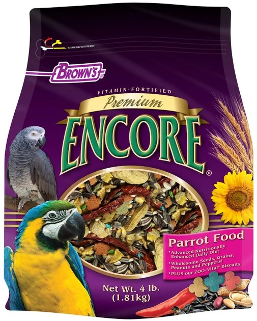 Brown’s Encore Premium Parrot Bird Food is a nutritionally advanced daily diet for parrots with added vitamins. Exciting shapes, appealing flavors and enticing colors and textures will help keep foraging instincts sharp while relieving cage boredom. Your parrot will enjoy the wholesome mix of striped sunflower seeds, safflower seeds, grains, peanuts and a little bit of spice from dried peppers. ZOO-Vital baked biscuits provide beneficial bacteria for optimal digestion and essential nutrients for the overall well-being of your pet.
