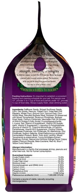 Safflower Seeds, Striped Sunflower Seeds, Corn, Oat Groats, Peanuts, Flaked Corn, Dried Red Chili Peppers, Wheat Flour, Ground Corn, Ground Oats, Corn Gluten Meal, Dehulled Soybean Meal, Soybean Oil (preserved with Mixed Tocopherols), Dicalcium Phosphate, Brewers Dried Yeast, Calcium Carbonate, Menhaden Fish Oil (Source of DHA & Omega-3 Fatty Acids), Fructooligosaccharide, L-Lysine, Salt, Vitamin A Supplement, Vitamin D3 Supplement, Vitamin E Supplement, L-Ascorbyl-2-Polyphosphate (Source of Vitamin C), Thiamine Mononitrate, d-Calcium Pantothenate, Vitamin B12 Supplement, Choline Chloride, Manganese Proteinate, Iron Proteinate, DL-Methionine, Zinc Proteinate, Sodium Selenite, Dried Pediococcus acidilactici Fermentation Product, Biotin, Folic Acid, Lecithin, Mixed Tocopherols (a preservative), Yucca Schidigera Extract, Rosemary Extract, Natural and Artificial Orange Flavor, Colors Added (Titanium Dioxide, Beta-Carotene, Red 40, Blue 1, Yellow 5 and Yellow 6).