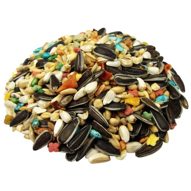 White Proso Millet, Canary Grass Seed, Wheat, Oat Groats, Safflower Seeds, Cracked Corn, Peanuts, Red Millet, Flaxseed, Canola Seed, Dried Carrots, Dried Pineapple, Dried Papaya, Dried Peas, Dried Red Chili Peppers, Wheat Flour, Ground Corn, Ground Oats, Corn Gluten Meal, Dehulled Soybean Meal, Soybean Oil (preserved with Mixed Tocopherols), Dicalcium Phosphate, Brewers Dried Yeast, Calcium Carbonate, Salmon Oil (Source of DHA & Omega 3 Fatty Acids), Fructooligosaccharide, L-Lysine, Salt, Vitamin A Supplement, Vitamin D3 Supplement, Vitamin E Supplement, L-Ascorbyl-2-Polyphosphate (Source of Vitamin C), Thiamine Mononitrate, d-Calcium Pantothenate, Vitamin B12 Supplement, Choline Chloride, Manganese Proteinate, Iron Proteinate, DL-Methionine, Zinc Proteinate, Sodium Selenite, Dried Pediococcus acidilactici Fermentation Product, Biotin, Folic Acid, Lecithin, Mixed Tocopherols (a preservative), Yucca Schidigera Extract, Rosemary Extract, Beta-Carotene, Artificial Cherry Flavor, Colors Added (Titanium Dioxide, Red 40, Blue 1, Yellow 5 and Yellow 6) and Sulfur Dioxide (a preservative).