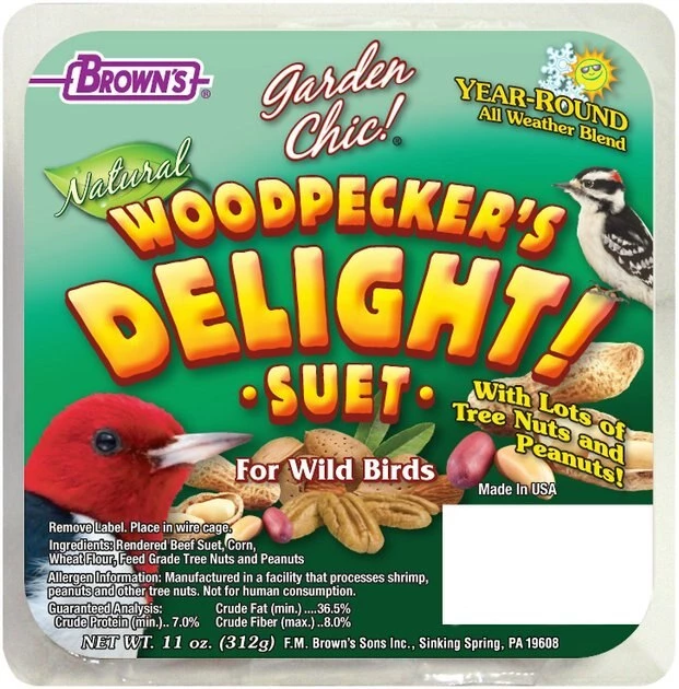 Brown’s Garden Chic! Woodpecker’s Delight! Suet Wild Bird Food helps bring all types of woodpeckers to your wild bird sighting areas. It’s filled with woodpecker favorites like pure, fresh beef suet, corn, wheat, peanuts, cashews and almonds for a year-round source of food. They fit easily into wire feeding baskets to provide the fat and energy birds need throughout the seasons for migration, nest building, molting and surviving harsh winters.