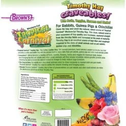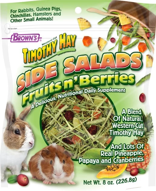 Give your furry friend a meal to satisfy her natural foraging instincts with Brown’s Timothy Hay Side Salads Fruits n’ Berries Rabbit Food. It features timothy hay with nutrient-rich real fruits and berries like papaya, pineapple and cranberries. This diet is rich in antioxidants and vitamins for rabbits, guinea pigs, chinchillas, hamsters and other small animals. It is also a highly digestible source of fiber and easier to feed than loose hay. With dried fruits and berries that are safer and more economical, consider Brown’s Timothy Hay Side Salads Fruits n’ Berries Rabbit Food as a reliable option to feed your little one.