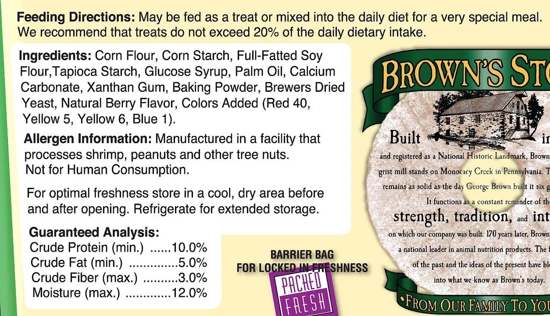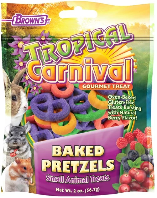 Add a bit of excitement and variety to feeding time with Brown’s Tropical Carnival Baked Pretzel Small Animal Treats. In the wild, small animals like rabbits, guinea pigs, chinchillas, hamsters, gerbils, rats and mice would feast on an assortment of fruits and berries to supplement their diet. These gourmet oven-baked pretzels deliver the natural berry flavors they love in an interactive treat that’s easy for them to grasp and carry. Chewing on these tasty snacks is also beneficial for maintaining healthy teeth and gums.