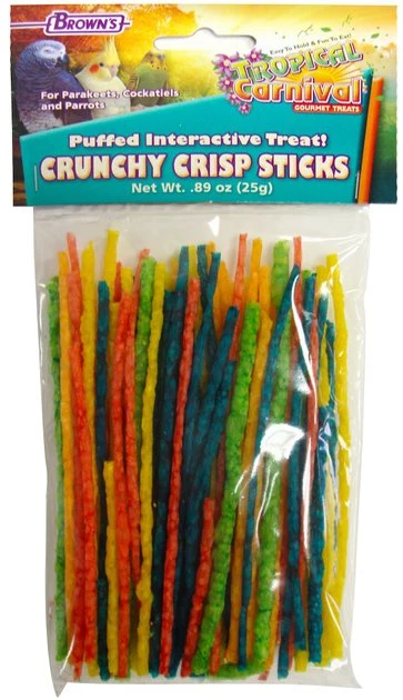 Add fun and excitement to feeding time with Brown’s Tropical Carnival Crunchy Crisp Sticks Bird Treats. These crunchy treats help satisfy your pet bird’s natural chewing instinct with an interactive treat that provides an enticing texture and array of interesting colors. They’re light and easy to grasp, making them a great treat for parakeets, cockatiels and parrots to enjoy as a tasty reward or addition to their regular food.