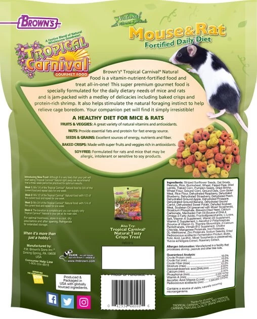 Brown’s Tropical Carnival Fortified Daily Diet Natural Mouse & Rat Food is free of filler seeds and hay to give your pet mouse or rat everything he needs in his diet. He’ll enjoy nibbling on a variety of surprise delicacies like freeze-dried shrimp and crunchy baked loops packed with nutrients and antioxidants. This tempting mix of gourmet seeds, grains, nuts, fruits and veggies is full of protein, vitamins and probiotics for your little friend’s overall health.