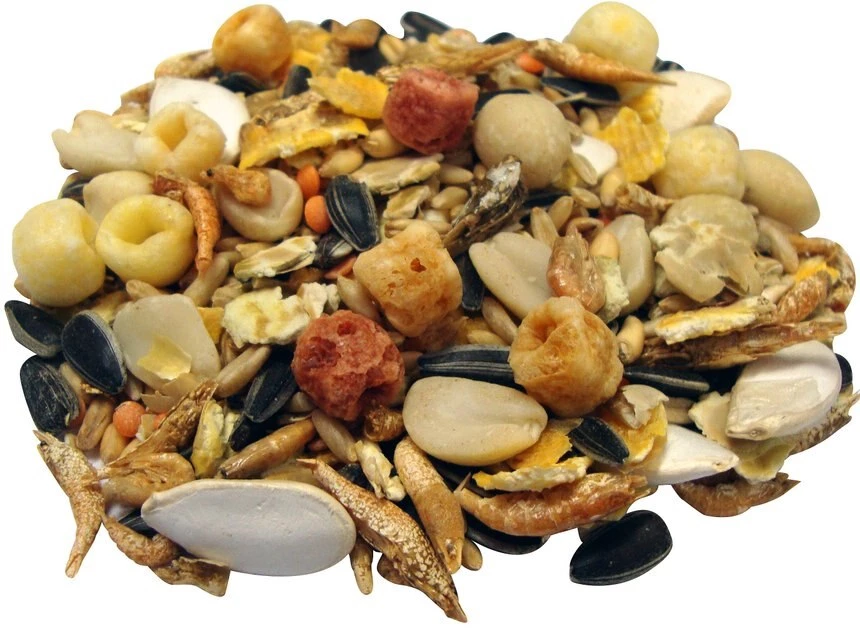 Striped Sunflower Seeds, Oat Groats, Peanuts, Rice, Buckwheat, Wheat, Flaked Peas, Dried Lentils, Flaked Corn, Pumpkin Seeds, Dried Shrimp, Wheat Flour, Ground Corn, Ground Oats, Corn Gluten Meal, Rice Flour, Dehydrated Raspberry, Dehydrated Blueberry, Dehydrated Strawberry, Dehydrated Peach, Dehydrated Ground Apple, Dehydrated Pineapple, Dehydrated Ground Banana, Dehydrated Ground Carrot, Dehydrated Sweet Potato, Dehulled Soybean Meal, Soybean Oil (preserved with Mixed Tocopherols), Dicalcium Phosphate, Brewers Dried Yeast, Calcium Carbonate, Menhaden Fish Oil (Source of DHA & Omega-3 Fatty Acids), Fructooligosaccharide, L-Lysine, Salt, Vitamin A Supplement, Vitamin D3 Supplement, Vitamin E Supplement, L-Ascorbyl-2-Polyphosphate (Source of Vitamin C), Thiamine Mononitrate, d-Calcium Pantothenate, Vitmain B12 Supplement, Choline Chloride, Manganese Proteinate, Iron Proteinate, DL-Methionine, Zinc Proteinate, Sodium Selenite, Dried Pediococcus acidilactici Fermentation Product, Biotin, Folic Acid, Lecithin, Mixed Tocopherols (a preservative), Yucca schidigera Extract, Rosemary Extract.