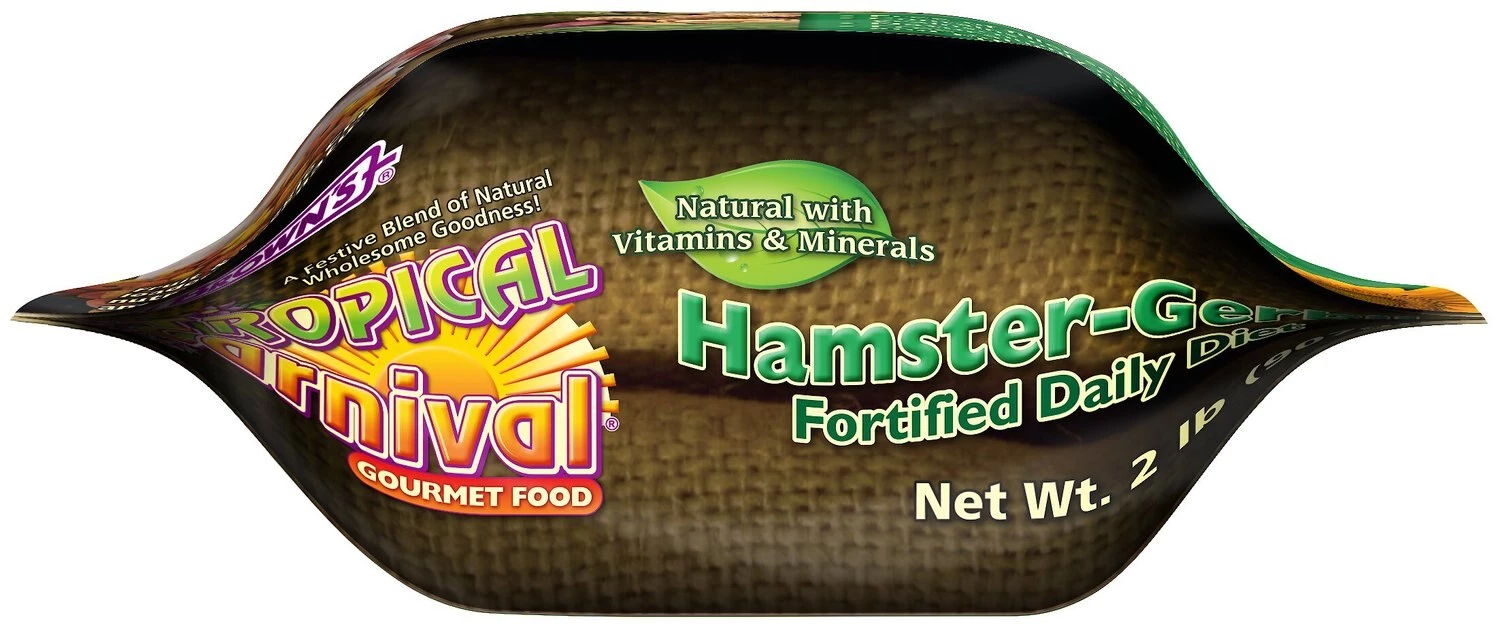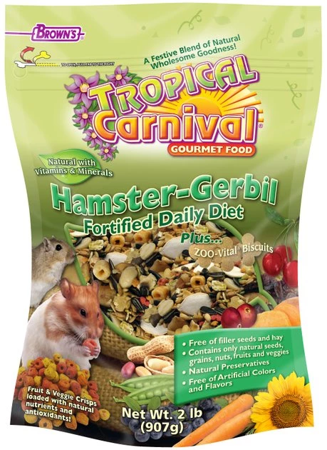 Brown’s Tropical Carnival Gourmet Gerbil & Hamster Food is a natural food and treat in one that’s made especially for the dietary needs of hamsters and gerbils. It’s got everything they love to eat in a mixture of tiny bites that are easy for small mouths to chew. This fortified blend is made with natural seeds, grains, nuts, fruits and veggies and no filler seeds or hay. Antioxidant-rich baked crisps provide a crunchy surprise along with ZOO-Vital biscuits for a deliciously nutritious meal.