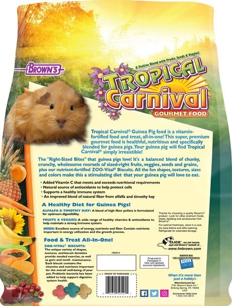 Brown’s Tropical Carnival Gourmet Guinea Pig Food is a premium food and treat in one that’s made especially for the dietary needs of guinea pigs. It’s got everything they love to eat in a mixture of tiny bites that are easy for small mouths to chew. This vitamin-fortified blend is made with all the delicacies your guinea pig loves, including high-fiber Timothy and alfalfa hay pellets, oats, barley, papaya, sunflower seeds, carrots, bananas and baked ZOO-Vital biscuits for an extra treat. Vitamin C is added to support your pet’s growth along with probiotics to ensure healthy digestion.