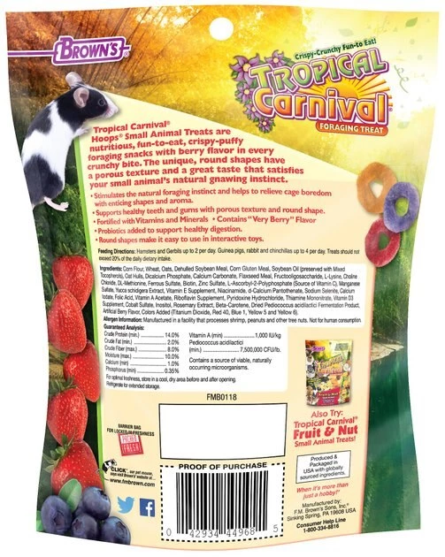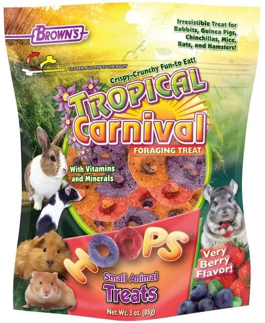 Brown’s Tropical Carnival Hoops Strawberry Flavor Small Animal Treats make great foraging and interactive treats for rabbits, guinea pigs, chinchillas, mice, rats and hamsters. These colorful hoops are fun to crunch and easy for little paws to hold as they nibble on the delicious natural flavors of honey and strawberry. Added DHA omega fatty acids and probiotics help keep coats shiny and ease the digestive tract as your pet enjoys a tasty treat.