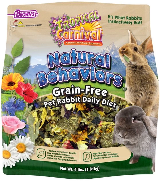 Give your rabbit a high-quality daily diet you both can agree on! Brown’s Natural Behaviors Grain-Free Daily Diet Rabbit Food encourages your fluffy friend to forage, chew and bunch with real ingredients found in nature like flowers, herbs and leaves, plus three varieties of Timothy hay. Not only is this food packed with the nutrition she needs, but by offering this natural eating experience, it will also help keep her busy and mentally stimulated! This recipe is 100% free from corn, wheat and soy, artificial colors, preservatives and flavors, and synthetic vitamins and minerals. And while other rabbit diets are loaded with seeds, nuts and sugary fruits, this food is not and is instead packed with goodness and a ton of fiber for healthy digestion.