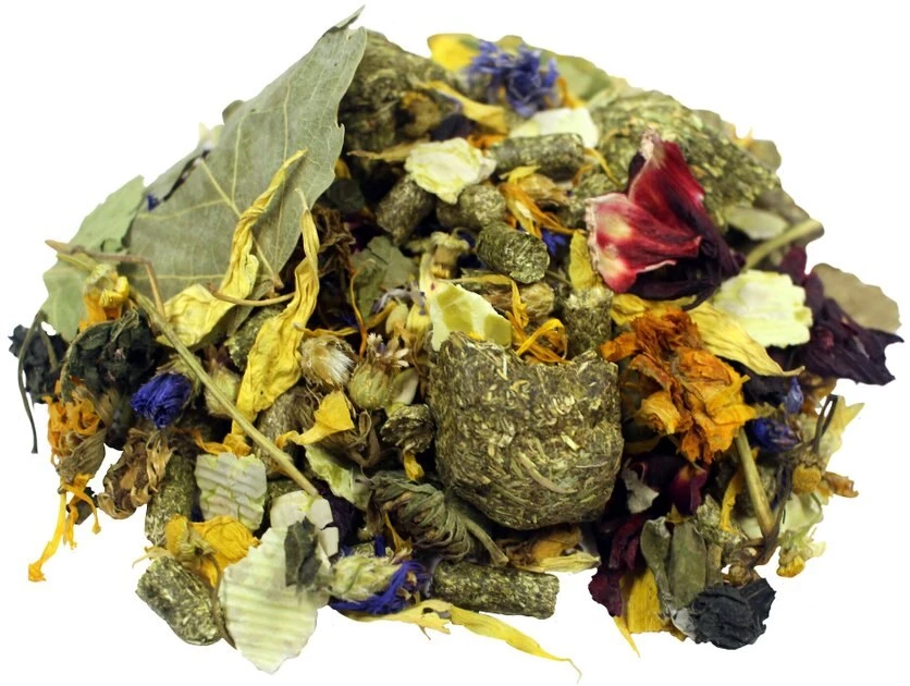 Ground Timothy Hay, Timothy Hay, Flaked Peas, Timothy Hay, Hibiscus Flowers, Marigold Flowers, Rose Petals, Nettle Leaves, Birch Leaves, Raspberry Leaves, Blue Cornflowers and Chamomile Flowers.