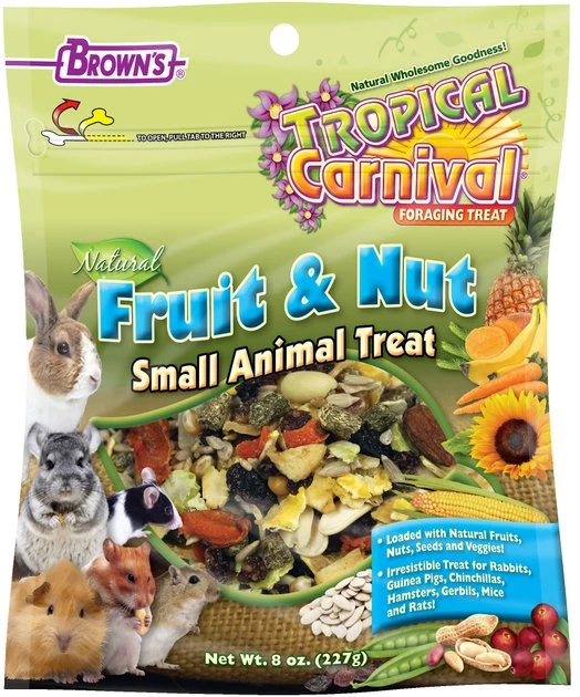 Give your little one a reward that’s just as nutritious as it is delicious! Brown’s Natural Fruit & Nut Small Animal Treat consists of chunky, chewy and crunchy fruits, nuts and veggies like ground timothy hay, dried pineapple, dried papaya, raisins, popcorn, sunflower hearts, flaked peas and more. Not only is every bite completely irresistible to small pets like rabbits, guinea pigs, chinchillas, hamsters, gerbils, mice and rats, but it’s also packed with nutrients to support their overall well-being.