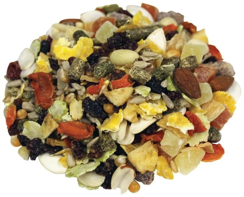 Ground Timothy Hay, Dried Pineapple, Dried Papaya, Raisins, Popcorn, Sunflower Hearts (Hulled Sunflower Seeds), Oat Groats, Flaked Peas, Flaked Corn, Peanuts, Almonds, Dried Banana, Dried Cranberry, Pumpkin Seeds, Dried Dates, Dried Sweet Potato, Dried Carrots, Sugar and Sunflower Oil.