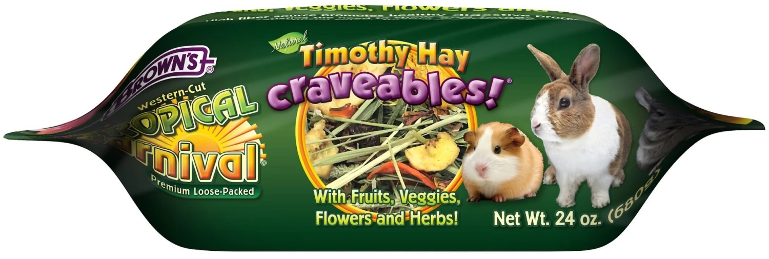 Give your small pet everything he craves with Brown’s Tropical Carnival Natural Timothy Hay Craveables! Small Animal Food. Premium sun-cured Timothy hay is high in fiber and provides an excellent roughage source for rabbits, guinea pigs and chinchillas. This soft hay is mixed with real fruits and veggies like papaya and cranberries plus tasty oat sprays for a loosely packed food that satisfies natural chewing and foraging instincts.