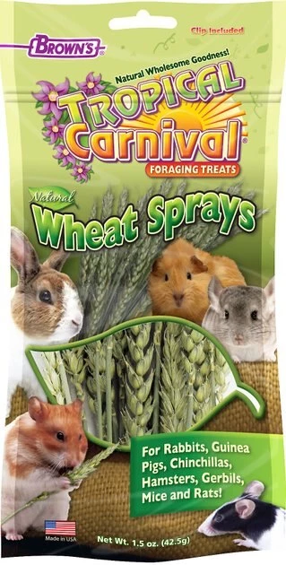 Brown’s Tropical Carnival Natural Wheat Sprays Small Animal Treats are simple snacks made from sun-ripened dry wheat sprays grown and harvested in the USA. This treat is naturally delicious, so you can feed it daily to satisfy the foraging urges of pet rabbits, guinea pigs, chinchillas, hamsters, gerbils, mice and rats. And because they’re 100% edible, there’s no mess to clean up when your small pal finishes his delicious snack.