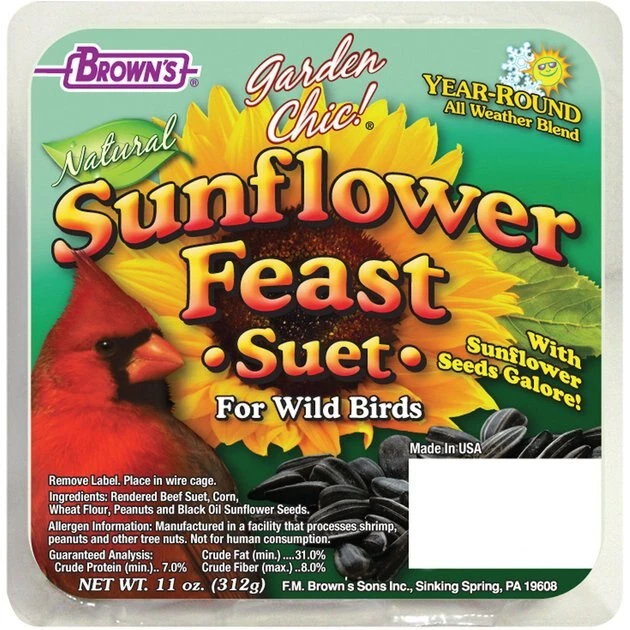 - Brown’s Garden Chic! Sunflower Feast Suet Cake Wild Bird Food—This fresh suet is made to support the energy needs of wild birds year-round.