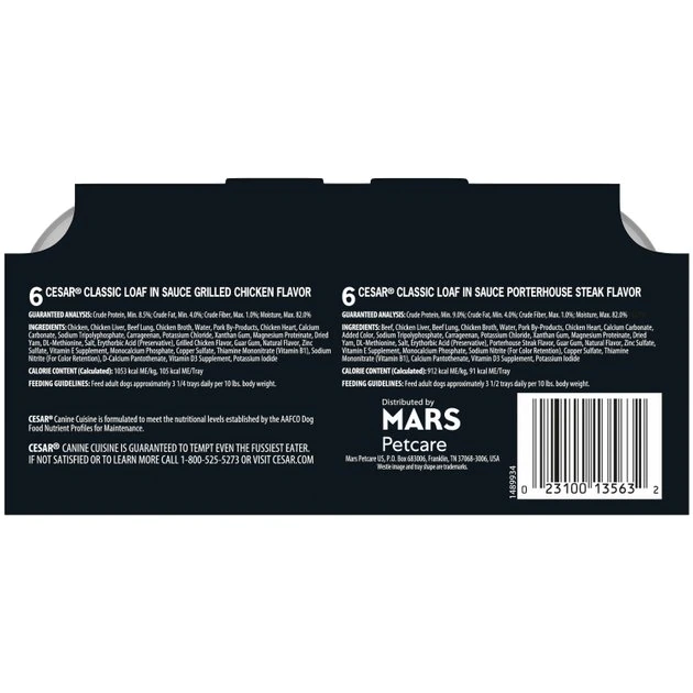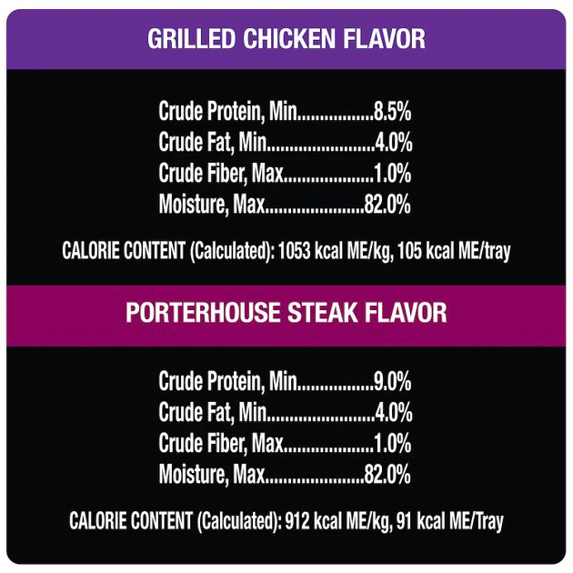 - Each pack comes with 12 trays and two recipes—Grilled Chicken Flavor and Porterhouse Steak Flavor. Serve the tasty classic loaf in sauce alone or with your pup’s favorite dry food.