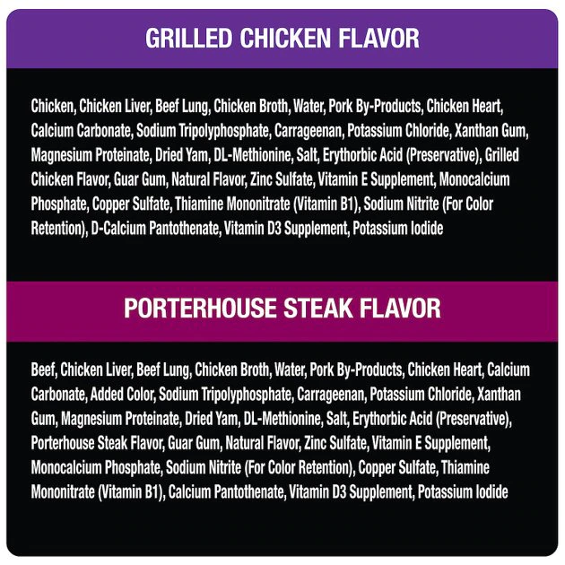 Porterhouse Steak Flavor: Beef, Chicken Liver, Beef Lung, Chicken Broth, Water, Pork By-Products, Chicken Heart, Calcium Carbonate, Added Color, Sodium Tripolyphosphate, Carrageenan, Potassium Chloride, Xanthan Gum, Magnesium Proteinate, Dried Yam, DL-Methionine, Salt, Erythorbic Acid (Preservative), Porterhouse Steak Flavor, Guar Gum, Natural Flavor, Zinc Sulfate, Vitamin E Supplement, Monocalcium Phosphate, Sodium Nitrite (For Color Retention), Copper Sulfate, Thiamine Mononitrate (Vitamin B1), Calcium Pantothenate, Vitamin D3 Supplement, Potassium Iodide.