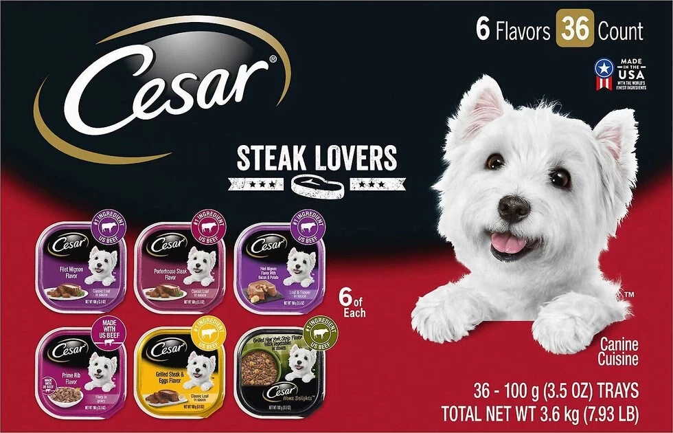 - Cesar Steak Lovers Variety Pack Dog Food Trays are made with real U.S. beef.