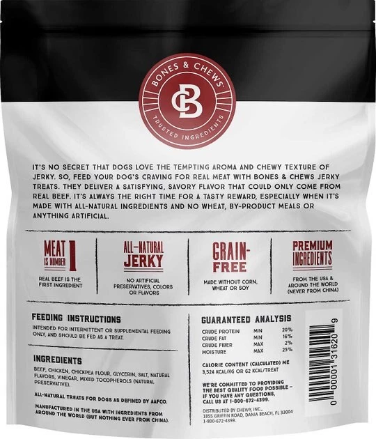 - Bones & Chews All Natural Grain-Free Jerky Made with Real Beef Dog Treats are all-natural beef jerky dog treats with a chewy texture and satisfying flavor that comes from real meat.