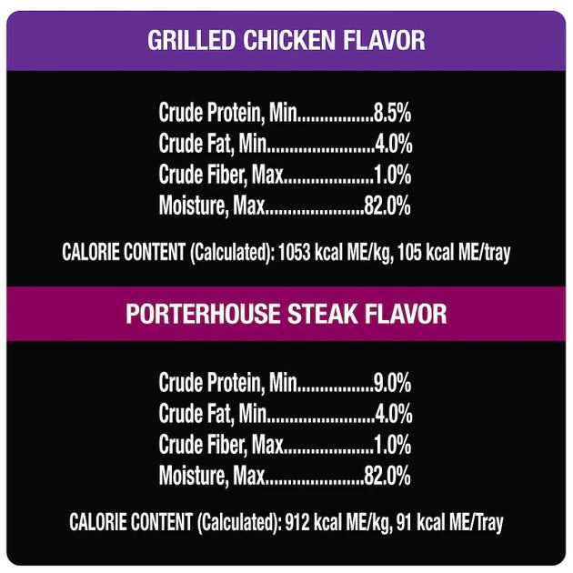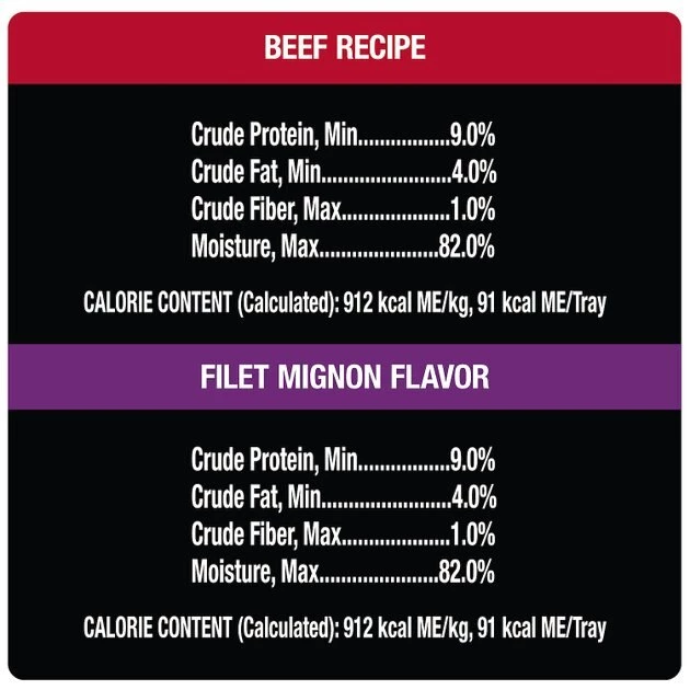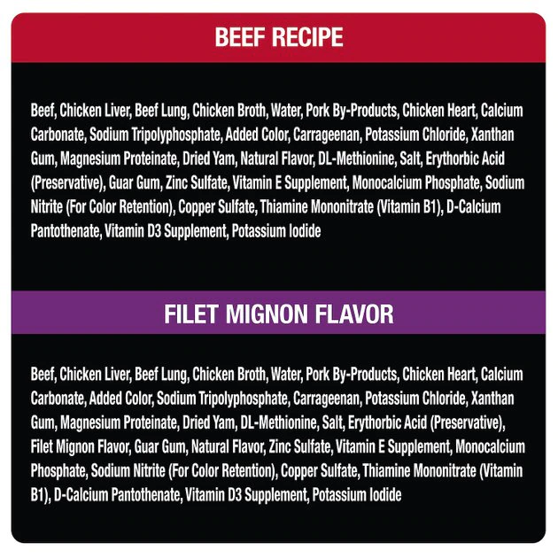 Filet Mignon: Beef, Chicken Liver, Beef Lung, Chicken Broth, Water, Pork By-Products, Chicken Heart, Calcium Carbonate, Added Color, Sodium Tripolyphosphate, Carrageenan, Potassium Chloride, Xanthan Gum, Magnesium Proteinate, Dried Yam, DL-Methionine, Salt, Erythorbic Acid (Preservative), Filet Mignon Flavor, Guar Gum, Natural Flavor, Zinc Sulfate, Vitamin E Supplement, Monocalcium Phosphate, Sodium Nitrite (For Color Retention), Copper Sulfate, Thiamine Mononitrate (Vitamin B1), D-Calcium Pantothenate, Vitamin D3 Supplement, Potassium Iodide.