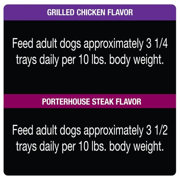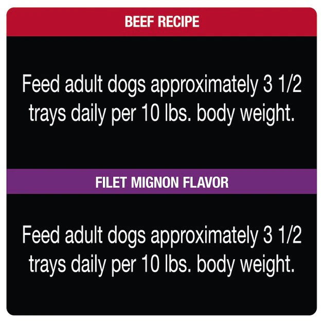 Feed adult dogs approximately 3 1/4 trays daily per 10 lbs. body weight