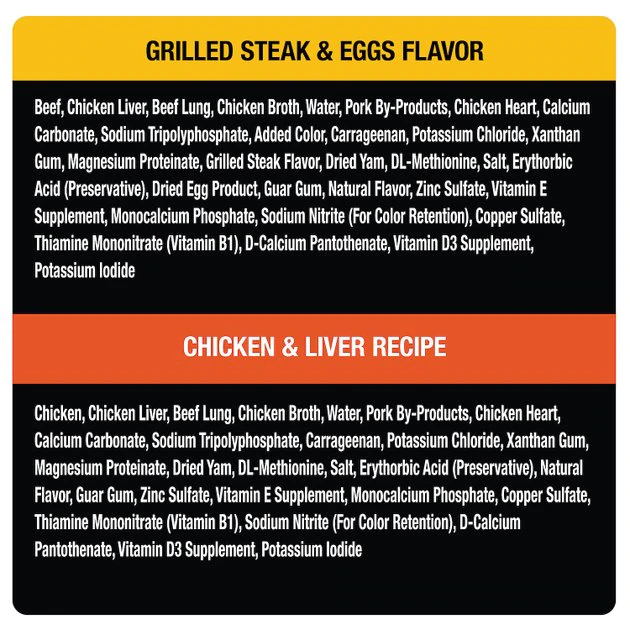 Steak & Eggs: Beef, Chicken Liver, Beef Lung, Chicken Broth, Water, Pork By-Products, Chicken Heart, Calcium Carbonate, Sodium Tripolyphosphate, Added Color, Carrageenan, Potassium Chloride, Xanthan Gum, Magnesium Proteinate, Grilled Steak Flavor, Dried Yam, DL-Methionine, Salt, Erythorbic Acid (Preservative), Dried Egg Product, Guar Gum, Natural Flavor, Zinc Sulfate, Vitamin E Supplement, Monocalcium Phosphate, Sodium Nitrite (For Color Retention), Copper Sulfate, Thiamine Mononitrate (Vitamin B1), D-Calcium Pantothenate, Vitamin D3 Supplement, Potassium Iodide.